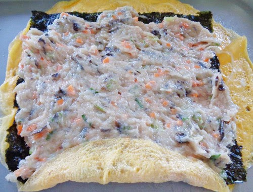 Bước 4: Gói chả bạn lấy lá rong biển đặt lên mặt trứng tiếp đó bạn cho thịt – tôm xay vào giàn đều ra và cuộn tròn lại, to hay nhỏ tùy thích vào cách bạn làm nhé.